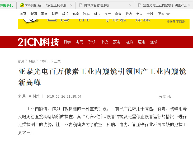 21CN科技:亞泰光電百萬像素工業(yè)內(nèi)窺鏡引領(lǐng)國產(chǎn)工業(yè)內(nèi)窺鏡新高峰