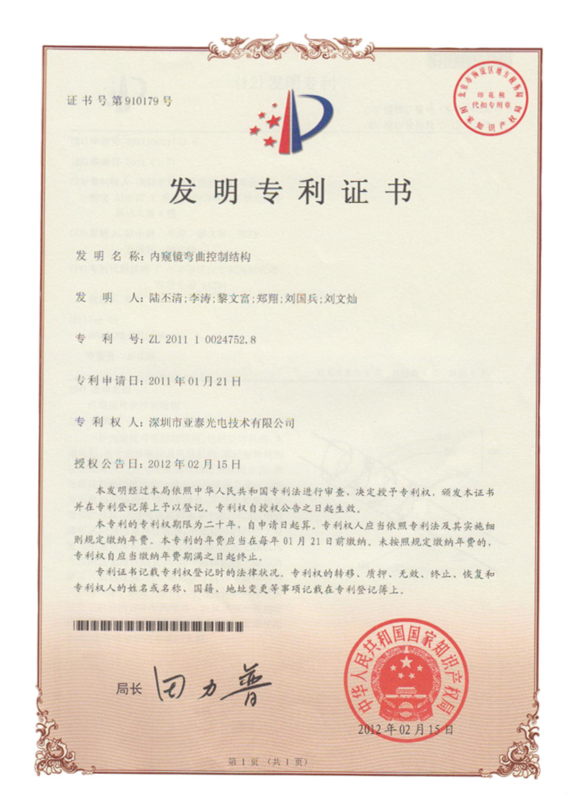 亞泰光電首頁 >> 走進亞泰 >> 亞泰光電資質(zhì)榮譽 >> 發(fā)明專利 >> 內(nèi)窺鏡彎曲控制結構