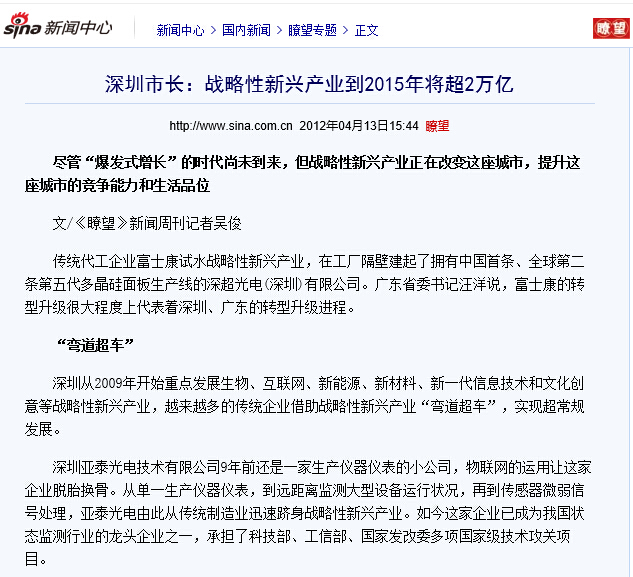 深圳市經濟貿易和信息化委員會相關負責人在接受《瞭望》新聞周刊記者采訪時說,過去一年,深圳經濟最引人注目的亮點就是戰(zhàn)略性新興企業(yè)的迅速崛起,涌現出一大批高成長的自主創(chuàng)新企業(yè)。