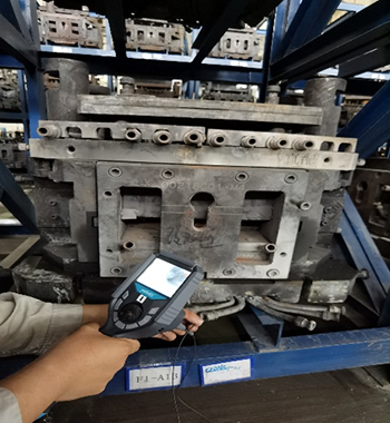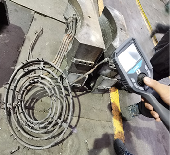 客戶現(xiàn)場(chǎng)主要看輪轂?zāi)ゾ邇?nèi)部通道的堵塞、脫落、毛刺情況,管通道孔徑13mm, 呈環(huán)狀分布,進(jìn)口5cm的位置,有雙向的分支通管,亞泰光電MIE高清系列內(nèi)窺鏡的探頭進(jìn)入導(dǎo)管后,需要分別從兩端進(jìn)入,本次演示時(shí),沒有2.8mm360°轉(zhuǎn)向的演示設(shè)備,需要手動(dòng)旋轉(zhuǎn)管線,預(yù)判轉(zhuǎn)向方位,清晰度方面客戶對(duì)MIE內(nèi)窺鏡非常認(rèn)可。導(dǎo)管內(nèi)部多處焊接的位置,實(shí)測(cè)時(shí)能明顯看見內(nèi)部的焊接堵塞,還有部分脫落,放置貨架的模具,內(nèi)部有大量灰塵、蟲子等多余物??蛻舴浆F(xiàn)場(chǎng)相關(guān)負(fù)責(zé)人表示他們前面找了很久類似的內(nèi)窺鏡產(chǎn)品,對(duì)亞泰光電2.2mm內(nèi)窺鏡產(chǎn)品效果很認(rèn)可,當(dāng)即表示了進(jìn)一步合作的意向。