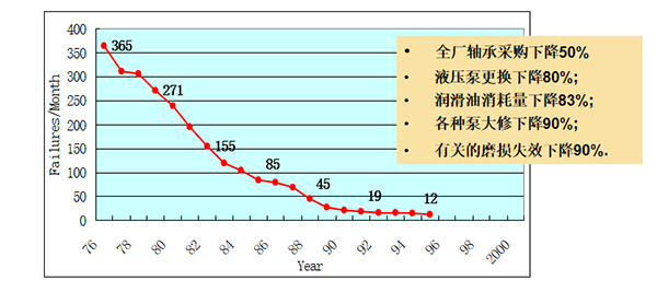 日本新日鐵公司在1980-1986年的六年間由于加強潤滑監(jiān)測與管理,使設(shè)備失效率下降了65%。