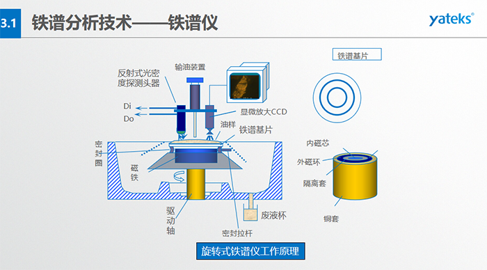 分析式鐵譜儀:利用高梯度磁場,將油液中的磨粒分離出來,按規(guī)則排列沉積在鐵譜基片上;借助于顯微鏡,分析磨粒的數(shù)量、 尺寸分布、成分、類型等,進而確定設備磨損的狀況。直讀式鐵譜儀:利用高梯度磁場,將油液中的磨粒分離并按大小排列于沉積沉積管; 借助于光密度計,測定所沉積大小磨粒的濃度,進而確定設備的磨損程度。旋轉式鐵譜儀:利用離心力和磁場力聯(lián)合作用, 將油液中的磨粒分離出來,呈輻射線狀按大小排列于鐵譜基片;借助于顯微鏡,分析磨粒的數(shù)量、尺寸、成分、類型等,進而確定設備磨損的狀況。