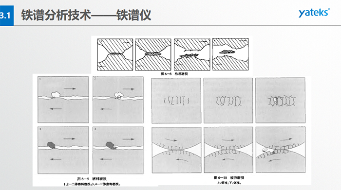 鐵譜儀的優(yōu)劣勢-優(yōu)勢:通過對金屬磨粒的形貌、大小及成分的微觀分析,直觀地獲得機械主要摩擦副表面的磨損情況(磨損類型,磨損程度,磨損部位等); 弱勢:分析速度慢,油液通過能力低,操作繁瑣費時,較大程度依賴于技術人員專業(yè)知識和經(jīng)驗積累