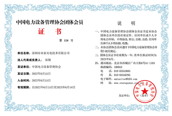 6月15日,深圳市亞泰光電技術(shù)有限公司正式接到中國(guó)電力設(shè)備管理協(xié)會(huì)頒發(fā)的“中國(guó)電力設(shè)備管理協(xié)會(huì)單位會(huì)員證書(shū)”,經(jīng)過(guò)前期申請(qǐng)、材料評(píng)審等一系列工作,亞泰光電正式成為中國(guó)電力設(shè)備管理協(xié)會(huì)的一員。
