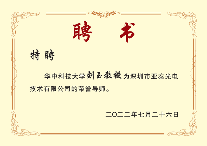 鄭總表示:國(guó)將興,必貴師而重傅。師者,傳道授業(yè)解惑。今天,非常榮幸的邀請(qǐng)到華中科技大學(xué)劉玉教授擔(dān)任亞泰光電榮譽(yù)導(dǎo)師,期望亞泰光電在劉玉導(dǎo)師的指導(dǎo)下能更上一個(gè)新臺(tái)階。劉教授帶領(lǐng)的Dian團(tuán)隊(duì)孵化出了60多家公司,誕生了2家獨(dú)角獸,其中,有25家企業(yè)估值過(guò)億,兩名弟子榮登福布斯“中國(guó)30位30歲以下創(chuàng)業(yè)者”榜單。劉教授用實(shí)際行動(dòng)詮釋了敬業(yè)、無(wú)私的高尚精神,為莘莘學(xué)子們謀劃了未來(lái),點(diǎn)亮了人生!
