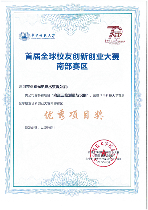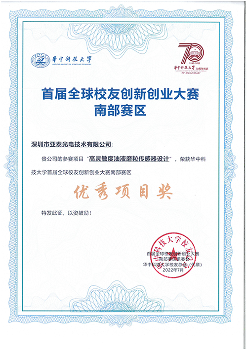 2022年6月26日,華中科技大學(xué)全球校友首屆創(chuàng)新創(chuàng)業(yè)大賽南部賽區(qū)決賽在深圳圓滿收官。深圳市亞泰光電技術(shù)有限公司在此次比賽中,“高靈敏度油液磨粒傳感器設(shè)計(jì)”和“內(nèi)窺三維測(cè)量與識(shí)別”兩個(gè)項(xiàng)目榮獲“優(yōu)秀項(xiàng)目獎(jiǎng)”。