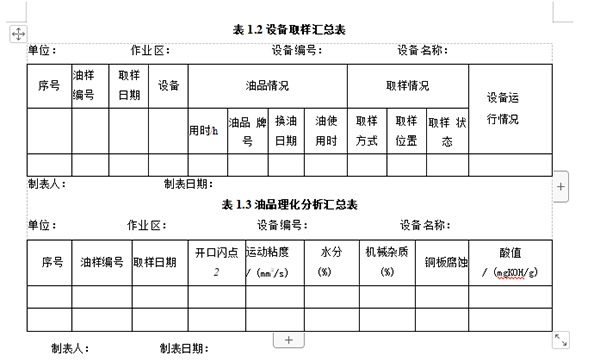 為了便于傳遞信息,對各類數(shù)據(jù)進(jìn)行對比和匯總分析,需要生成各類報(bào)表, 以備分析需要選擇。生成的報(bào)表可包括:①油液報(bào)表,包括油樣明細(xì)表、單機(jī) 取樣記錄匯總表、油樣月度匯總表等;②油品理化分析報(bào)表,包括油樣分析結(jié) 果表、單機(jī)潤滑理化分析匯總表、單臺(tái)設(shè)備潤滑記錄表等;③鐵譜分析結(jié)果表, 包括磨粒成分匯總表、磨粒濃度數(shù)據(jù)匯總表、鐵譜分析記錄表等;④油液監(jiān)測 結(jié)論表等。下面給出了 “設(shè)備取樣匯總表”和“油品理化分析匯總表”的樣表, 見表1.1和表1.3。