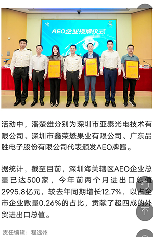第六屆全球AEO大會(huì)將于今年5月在深圳隆重舉行,此次大會(huì)受到人民日報(bào)的關(guān)注,并在“有品質(zhì)的新聞”進(jìn)行了專題報(bào)道,文中提到:屆時(shí)深圳海關(guān)領(lǐng)導(dǎo)將向深圳亞泰光電代表頒發(fā)AEO牌匾。這一盛會(huì)將在全球范圍內(nèi)進(jìn)一步推動(dòng)行業(yè)交流與合作,為近千名參會(huì)者帶來無與倫比的學(xué)習(xí)和交流機(jī)會(huì)。這是該領(lǐng)域最高級(jí)別的全球性會(huì)議,對于促進(jìn)貿(mào)易強(qiáng)國建設(shè)具有重要意義。