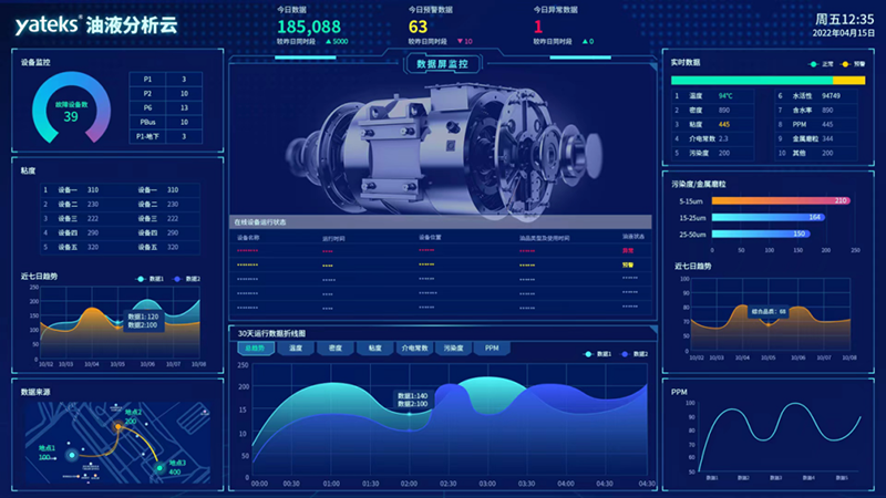 亞泰光電的油液在線監(jiān)測(cè)系統(tǒng)集成了多種技術(shù)先進(jìn)的在線油液監(jiān)測(cè)傳感器,實(shí)時(shí)采集油液的動(dòng)力粘度、密度、溫度、水分含量、金屬磨粒指標(biāo)等關(guān)鍵參數(shù),并結(jié)合AI算法分析數(shù)據(jù)趨勢(shì),實(shí)現(xiàn)從“被動(dòng)維修”到“主動(dòng)預(yù)防”的跨越。例如:系統(tǒng)可精準(zhǔn)監(jiān)測(cè)320號(hào)齒輪油的健康狀態(tài),提前預(yù)警潤(rùn)滑系統(tǒng)異常,避免因漸發(fā)性故障升級(jí)導(dǎo)致的停機(jī)損失。