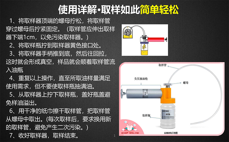 亞泰光電YBC負(fù)壓油品取樣器產(chǎn)品隆重升級(jí)為油品取樣器套裝,加量不加價(jià),升級(jí)后的油品取樣器套裝包含:油品取樣器、油液取樣管、油液取樣瓶、取樣器密封圈、高品質(zhì)外箱,油品取樣器采用負(fù)壓抽油槍,搭配一次性無(wú)污染油液取樣管、油品取樣瓶,有效避免外界雜質(zhì)污染油樣;取樣器可用于對(duì)現(xiàn)場(chǎng)的潤(rùn)滑油等油液取樣,帶回實(shí)驗(yàn)室進(jìn)行鐵譜、光譜、粘度、鐵量等指標(biāo)的分析。
